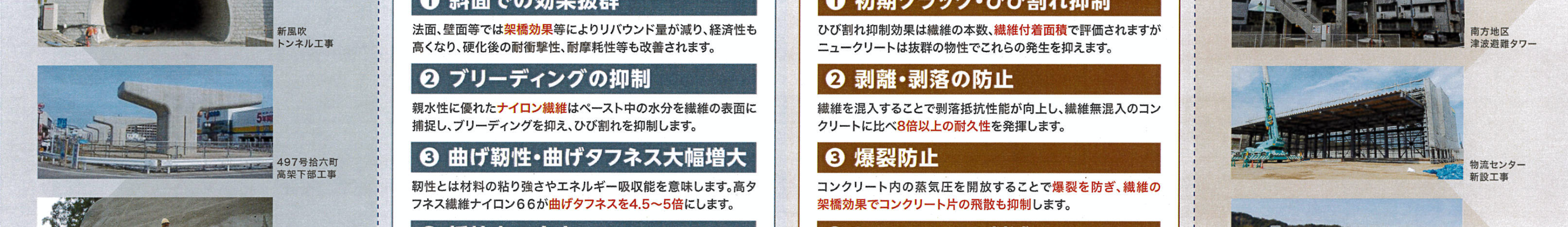 ニュークリートセカンドは、爆撃に対するコンクリート補強を研究開発しているイスラエル企業が、 コンクリート・モルタルのひび割れ抑制を目的に開発したナイロン繊維です。 特殊表面処理(国際特許)によりファイバーボールの形成がありません。 配合設計はそのままで靭性(ねばりのある)コンクリートになります。 1.製品仕様 コンクリート1㎥あたり 1袋(300g) 材質 ナイロン66 2.品質 国交省NETIS(新技術情報提供システム)2020年8月登録予定 ARIC(一般社団法人農業農村整備情報総合センター)登録番号1134z 関東農政局、九州農政局、宮崎県県土整備部等に登録済み JR東日本は、2003年1月以降の新設構造物の剥落防止対策として合成繊維による繊維補強コンクリートを適用することを決定。 ニュークリートは該当繊維として認定されました。 3.用途 橋梁・高架橋の床板部、壁高欄、地覆部 トンネル覆工、吹付工 法面、法枠工 湾岸のコンクリート構造物 高強度コンクリート構造物 高層ビル、RC造建築物など 戸建住宅の基礎、土間 モルタル・珪藻土など 舗装コンクリート コンクリート二次製品
